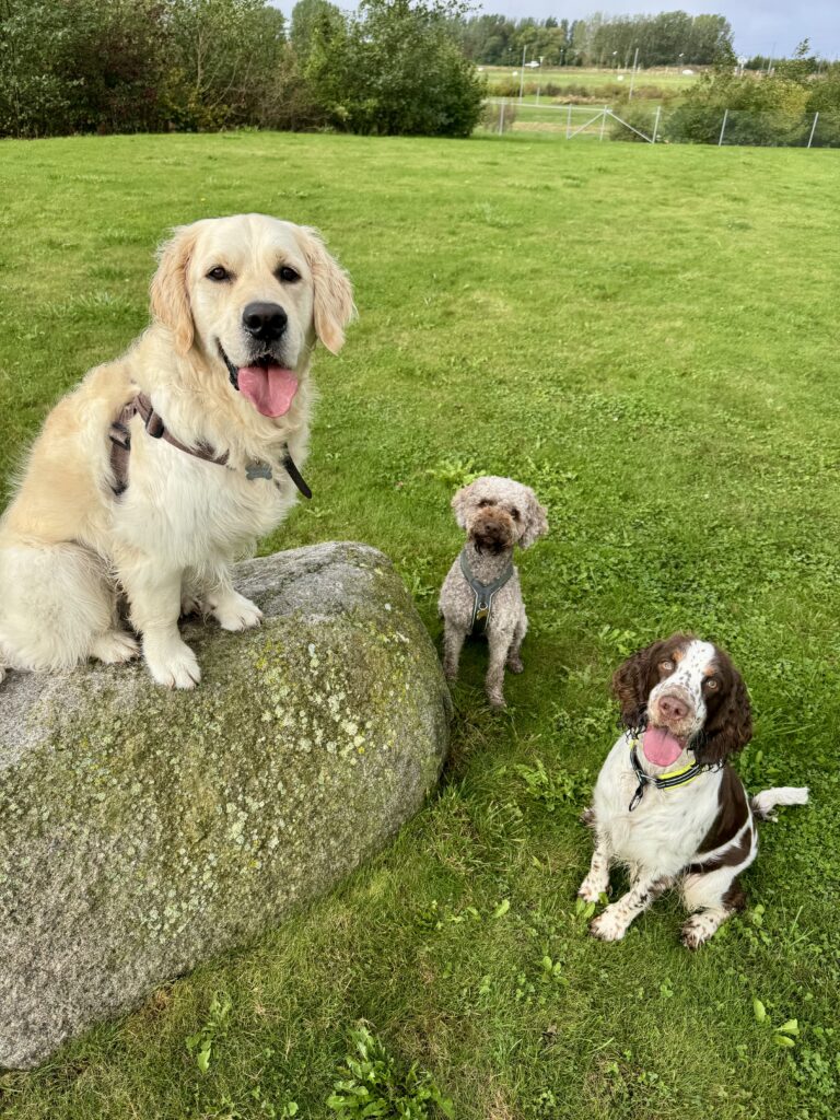 Utöver promenaderna tränar och leker vi varje dag. Givetvis får de springa utan koppel i säkra inhägnade rastgårdar, där varje hund får utlopp för både energi och nyfikenhet.