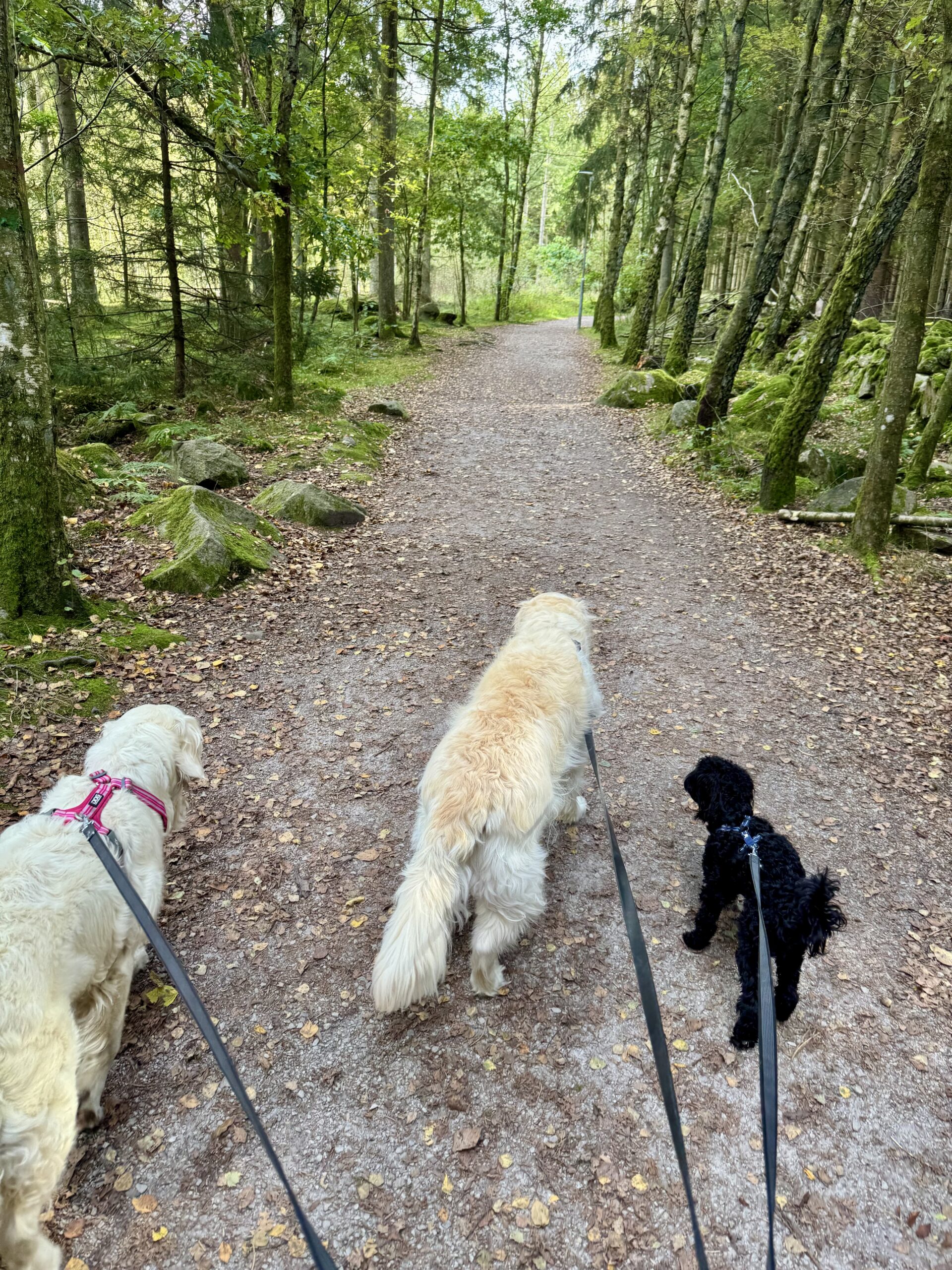 Under dagen är vi ute i skogar, på stränder och i rastgårdar runt om i Skåne, vilket ger gott om variation. Hundarna får promenera, leka och utforska naturen flera timmar varje dag.